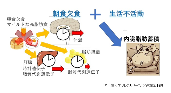 その理由として研究グループは、「朝食欠食をすることで、体内時計が乱れて、体温上昇のリズムが遅れ、肝臓や脂肪組織の脂質関連遺伝子のリズムも遅れることで、脂質代謝の乱れて内臓脂肪の蓄積が起きた」と説明しています。