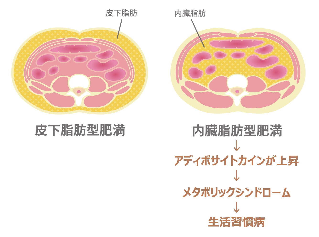 近年の研究では、内臓脂肪型肥満になると、脂肪細胞から健康に悪影響を及ぼすアディポサイトカインという生理活性物質が放出され、将来的に生活習慣病の発症につながることがわかってきています。