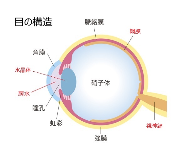 目の中には「房水(ぼうすい)」という透明な液体があり、角膜や水晶体に栄養を運び、老廃物を排出する重要な役割を担っています。