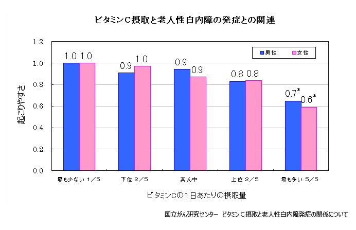 日本人を対象とした研究では、ビタミンC摂取量が多い人ほど白内障の発症リスクが低く、男性で35%、女性で41%も低下していたことが報告されています。