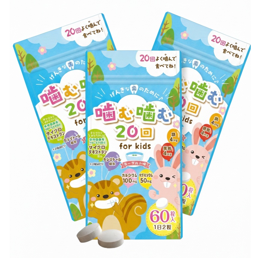 噛む噛む20回 for kidsは、毎日の食事を大切にしながら、成長期に不足しやすい栄養をやさしく補うことを目的に開発された、噛んで食べるタイプのタブレットです。
