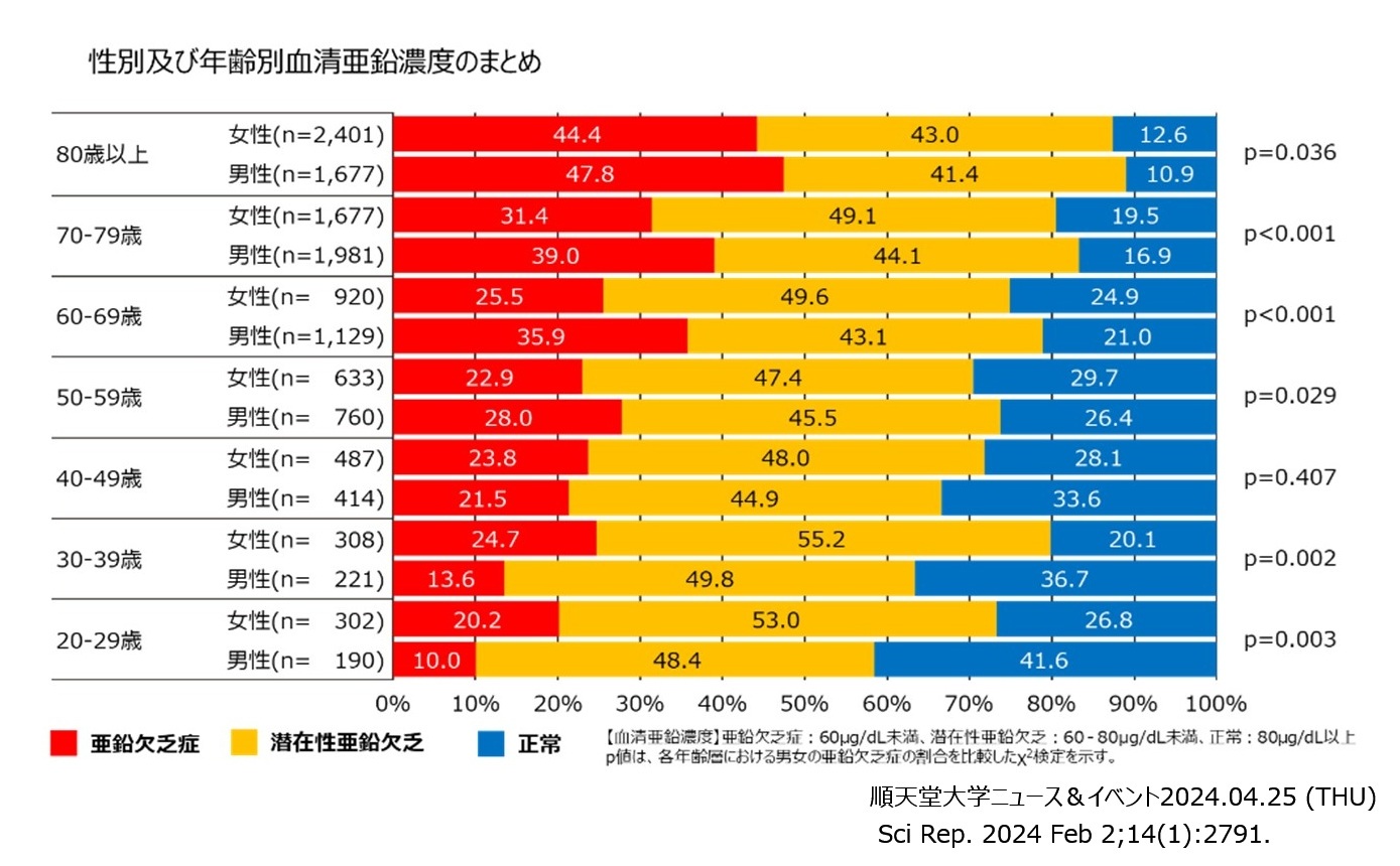 国内の医療機関から収集した13,000人を超えるデータの解析では、男性で36.6%、女性で33.1%と高頻度で亜鉛欠乏症が認められています。